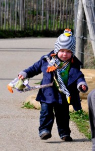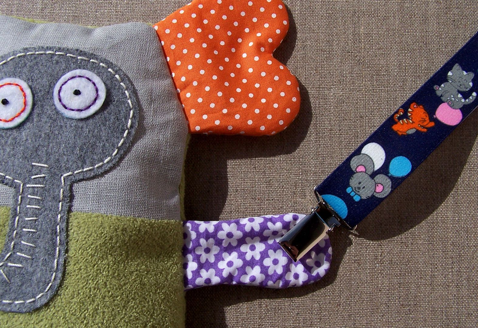 Trompetto, le doudou préféré de Malo, a eu bien des malheurs. Comme vous l’avez peut-être lu (dans son commentaire sous « Dix petits doudous »), il a d’abord perdu un oeil (depuis, je couds tout le pourtour…), puis il s’est perdu à Paris. Il a fini par revenir, avec deux yeux, et tout neuf ! Et avec une attache-doudou !
