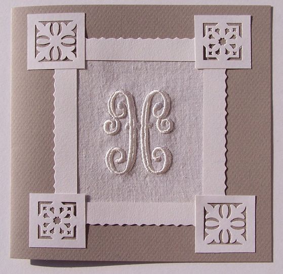 Papier Canson couleur lin, initiale brodée à la machine sur du tissu de récup (vieux draps).