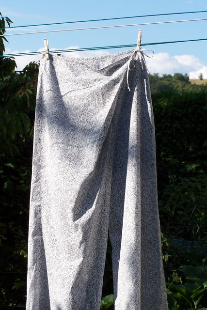 J’avais prévu de le coudre l’été dernier… Les choses en sont restées au tracé du patron sur le tissu (au feutre effaçable à l’eau). Et puis l’automne est arrivé, et je me suis dit que le modèle et le tissu ne sont plus adaptés à la saison, et que ça peut attendre.