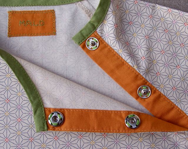 De grosses pressions ferment la tunique. Elles sont cousues avec de l’épais coton vert pour que les points soient décoratifs à l’endroit.