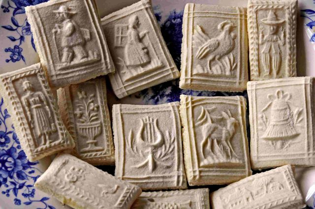 Tourner en mousse 500 g de sucre et 4 œufs (dont le poids total avec la coquille fait environ 240 g) pendant 10 min au batteur. Ajouter 550 g de farine, 3 g de levure chimique et 2 c. à soupe de grains d’anis. Bien pétrir la pâte et la laisser reposer ½ h avant de l’étaler au rouleau sur une épaisseur de 5 à 7 mm (bien fariner le plan de travail, sinon la pâte y reste collée).