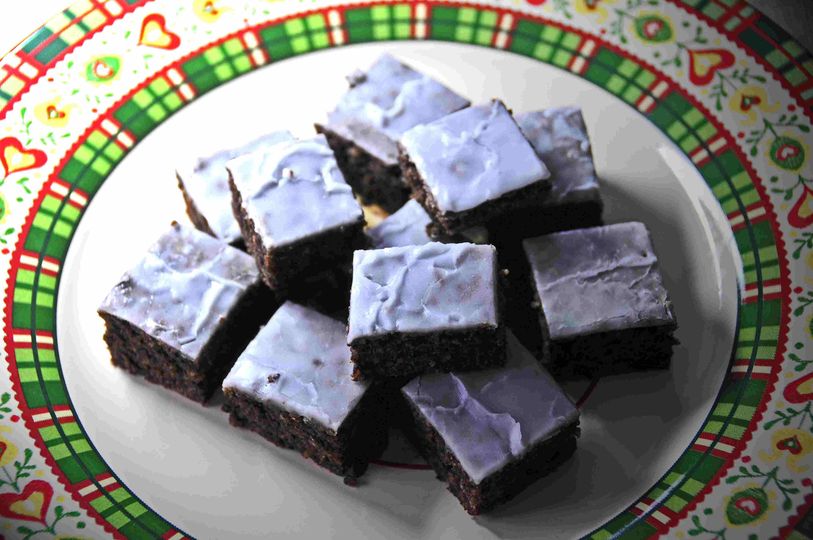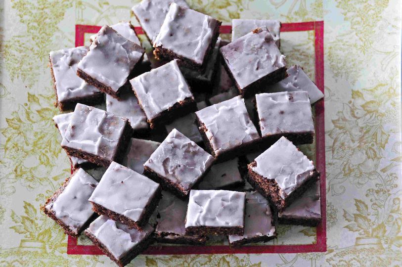 Préparer un glaçage avec du sucre glace et un peu d’eau, glacer, puis découper en carrés.