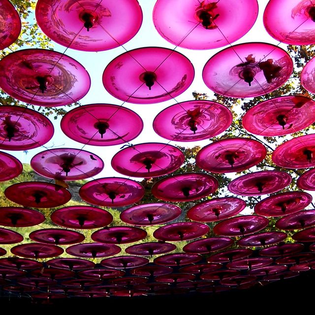 Ils constituent le plafond d’une sorte de petite cabane, dans le « Jardin de la Paix » à Bitche, à quelques dizaines de km de chez moi. C’est un jardin sympa, avec plein d’installations d’artistes, souvent sur le thème du verre puisque la région de Bitche était un pays de verriers (il ne reste malheureusement plus que la cristallerie de Saint-Louis, réputée pour sa production de luxe).