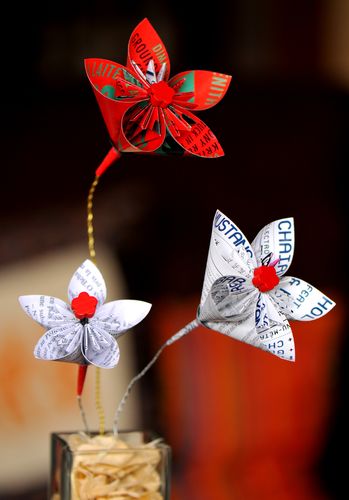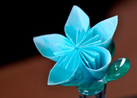 J’ai utilisé des carrés de 7, 8 ou 9 cm de côté ; papier de récup’ et papier mûrier (pour la fleur turquoise).