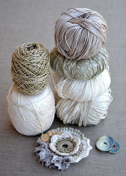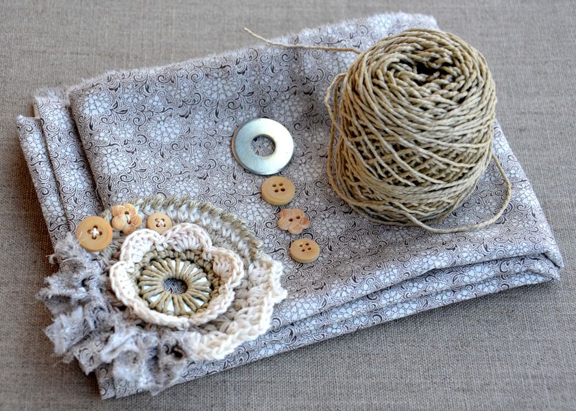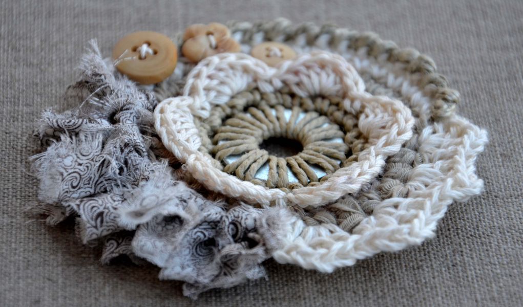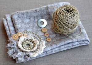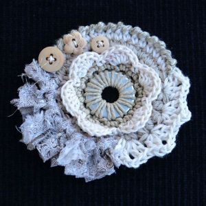 Pas de couleurs qui claquent, mais des blancs cassés et des beiges, des couleurs « zen »; une rondelle de métal au centre, puis deux rangs de ficelle (pas plus, les articulations de ma main n’aiment pas…), trois petits boutons en bois et des bandes de tissu effilochées passées dans le dernier rang.