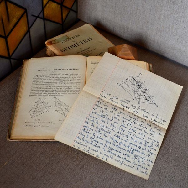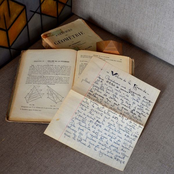 Une feuille calligraphiée recto-verso trouvée dans l’un des livres; en arrière-plan, deux de mes tableaux, parmi les tout premiers.