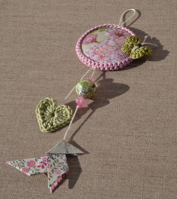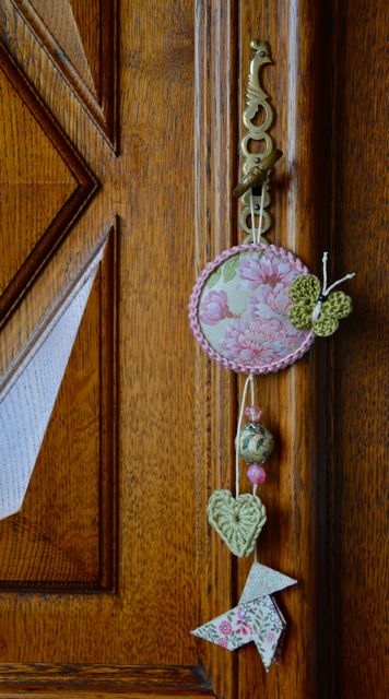 Je voulais faire un collier, mais j’ai trouvé le médaillon un peu trop grand. En m’inspirant du très joli cadeau que m’a fait Gedane, je l’ai converti en déco de porte.