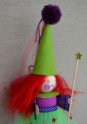 Le chapeau est un cône en feutrine renforcée de Vliesline. Je l’ai fermé par une couture faite à l’endroit, puis rajouté des bandes de tulle, des bouts de fils et un pompon.