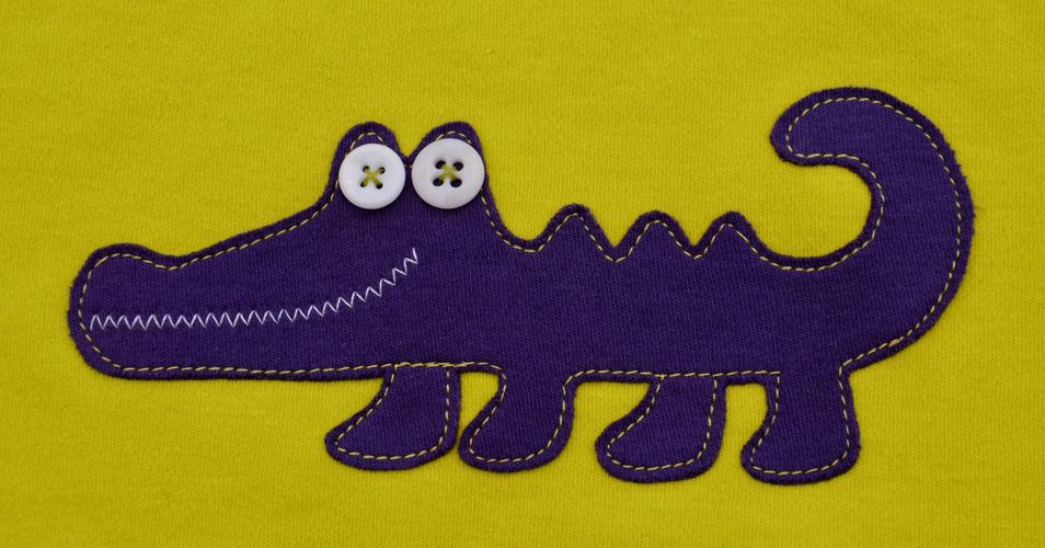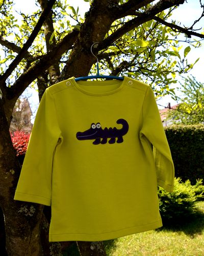 L’application « crocodile », en interlock violet, est thermocollée, puis cousue à la machine au point droit; deux petits boutons anciens en verre pour les gros yeux, une ligne de zig-zag pour figurer les dents. Pour le croquis, je me suis inspirée du dessin animé « Didou dessine-moi un crocodile« . Eh oui, grâce à Malo, Mamie revoit sa culture…