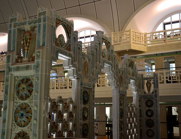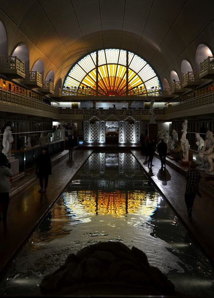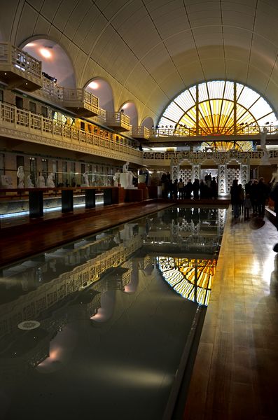 Le bâtiment, à lui seul, vaut le déplacement et offre un superbe écrin aux oeuvres présentées. Un plan d’eau, à la place du bassin originel, rappelle la fonction première du lieu. De part et d’autre, sur deux niveaux, les cabines et les douches ont été converties en alcôves où se nichent céramiques, tissus, bijoux… Une réhabilitation admirable !