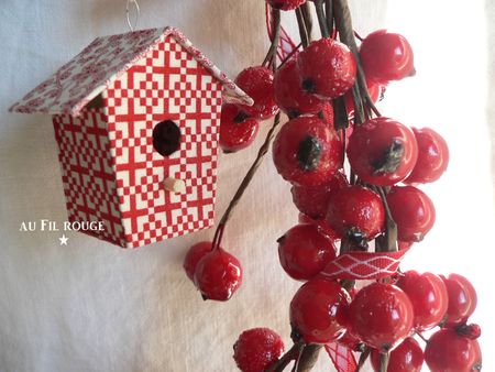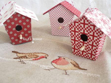 Les couleurs que j’aime, rouge et blanc… De jolis nichoirs, un triptyque de Noël, et bien d’autres superbes créations, joliment mises en scène…