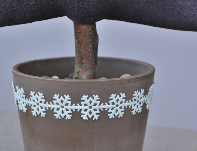 Le tronc est cloué sur une petite planchette à la taille du fond du pot, qui constitue le socle et donne une bonne stabilité au sapin. J’ai rempli le pot de « copeaux » de polystyrène (ceux qui sont utilisés pour caler les objets dans les colis, et que je garde, of course).