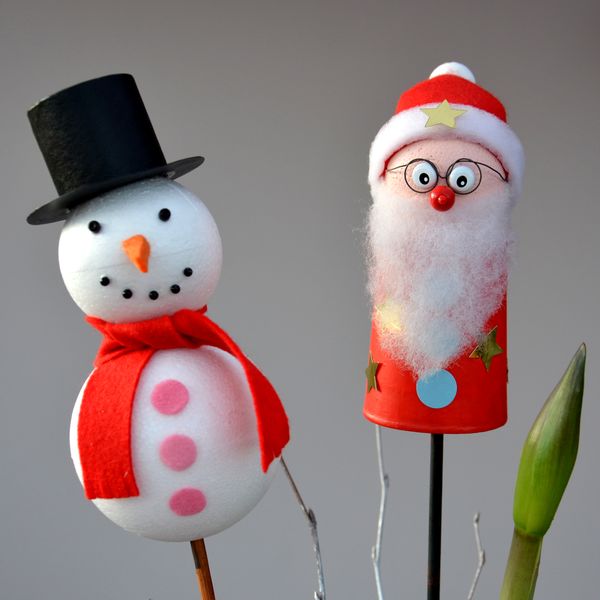 Pour le Père Noël, le corps est un pot de yaourt en carton, dont l’ouverture est fermée par un rond de carton, le tout peint en rouge ; la tête, une boule de polystyrène.