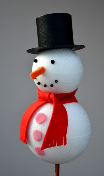 Pour le bonhomme de neige, deux boules de polystyrène de tailles différentes ; le chapeau est fait d’un cylindre coupé dans un rouleau de papier WC et de deux ronds de carton… Deux perles noires pour les yeux, un nez fait de deux épaisseurs de feutre orange et des épingles à têtes de verre noires pour la bouche ; une écharpe et des boutons en feutrine.