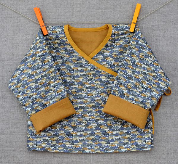 Taille 74. Je n’ai rien modifié, à part la longueur des manches qui étaient courtes sur le modèle. Je les ai simplement rallongées, en espérant avoir visé à peu près juste.