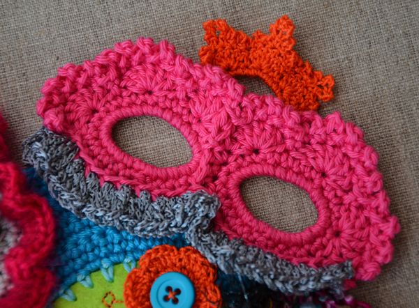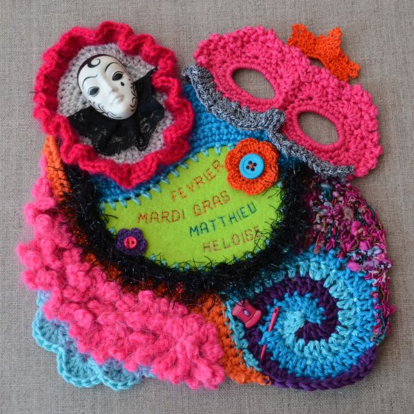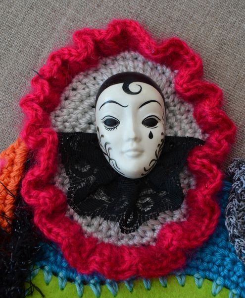 Mois du Carnaval… Un loup en dentelle au crochet, un Pierrot (une broche bricolée il y a très, très longtemps, plus portée depuis longtemps, mais gardée au fond d’un tiroir…), et des couleurs vives, comme les beaux costumes du Carnaval de Venise…