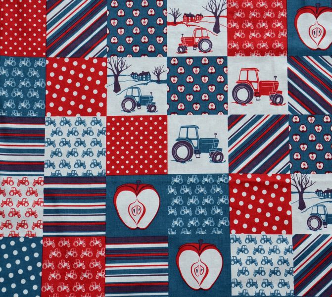 Tissu « Ferme » de Panduro, un brin « rétro ». Les tissus Panduro ne sont pas vraiment bon marché, mais il faut reconnaître qu’ils sont d’excellente qualité et que l’impression est impeccable (ici, par exemple, les lignes horizontales sont parfaitement perpendiculaires aux lisières). Doublure en tissu rouge étoilé de Natacha Tissus, à Grenoble (partout où je passe, je repère les magasins de tissus…)