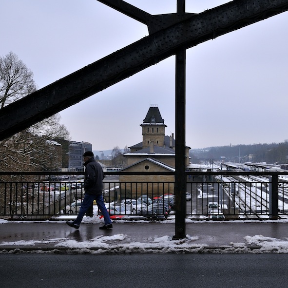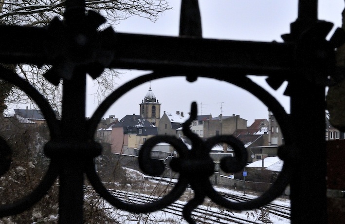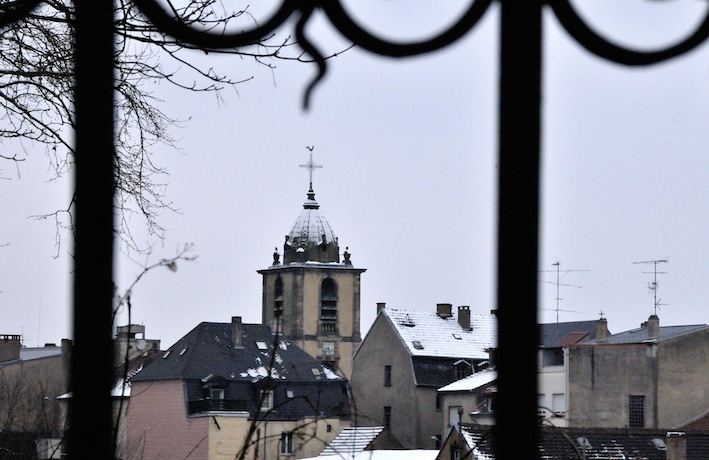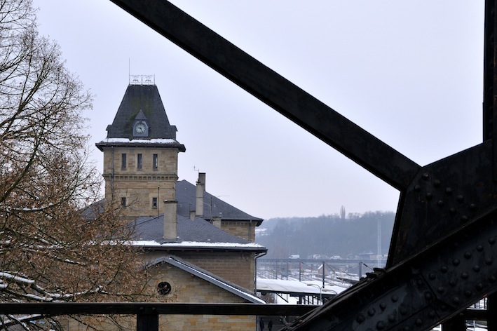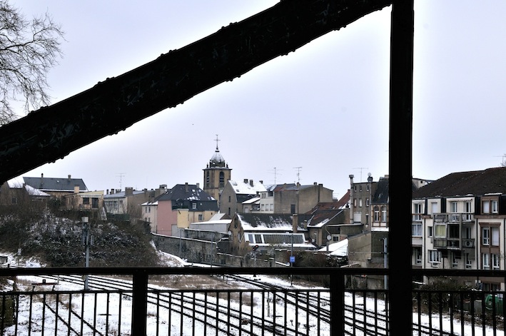 Photos prises à partir du pont métallique qui enjambe les rails, à Sarreguemines. Vue sur la gare d’un côté, sur l’église Saint Nicolas de l’autre.
