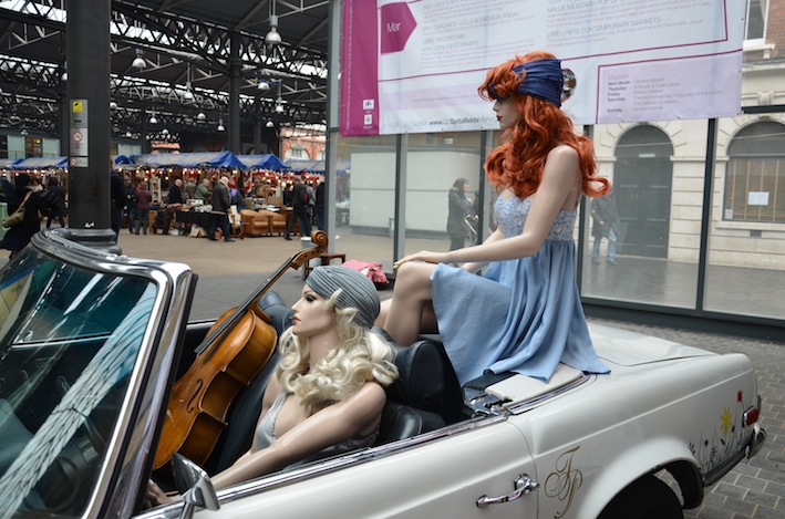 Deux mannequins installés dans une luxueuse voiture à Spitalfiels Market…