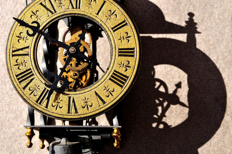 Une de nos pendules, décrochée pour la photo et posée au soleil (eh oui ! il y en avait, aujourd’hui ; première journée presque printanière… Environ 10°, mais on a trouvé qu’il faisait chaud… Tout est relatif !)