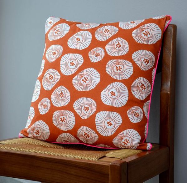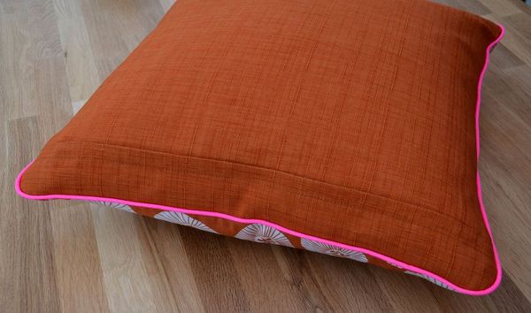 Le tissu vient de « Pas Sage Obligé« , à Grenoble. C’est la charmante jeune femme qui tient la boutique, qui m’a conseillé le passepoil fluo. Ce choix ne me serait pas venu à l’idée, mais j’aime bien. Ce rose donne au coussin une petite touche d’originalité.