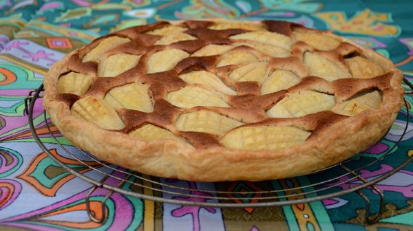 Peler des poires, les couper en quartiers. Inciser le côté bombé en formant des quadrillages. Disposer les quartiers en cercle sur la pâte, côté bombé dessus. Faire cuire au four préchauffé à 180°, 30 à 40 minutes (surveiller la cuisson ; recouvrir éventuellement d’alu, si nécessaire).