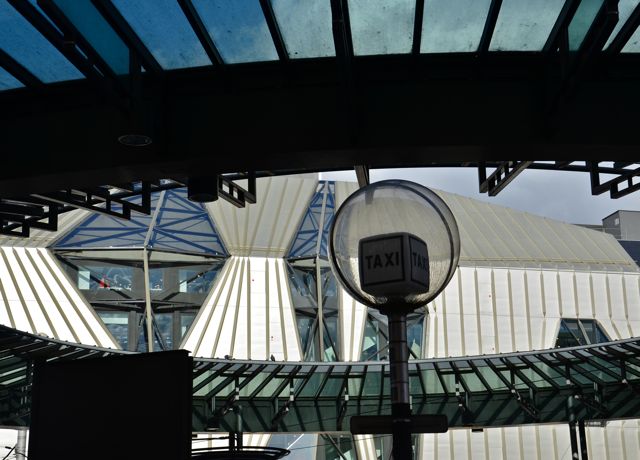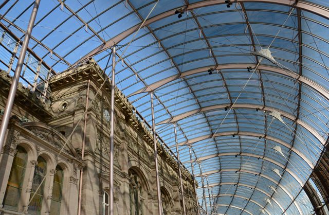 Lorsqu’on déambule sous la verrière, le contraste entre cette immense surface courbe vitrée et la façade 19e siècle en grès est saisissant. Vue de l’extérieur, la verrière dissimule complètement le bâtiment et fait un peu immense « soucoupe volante » : j’aime moins.