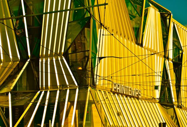 Si j’aime bien la verrière du tram, je n’apprécie pas la façade du Printemps !