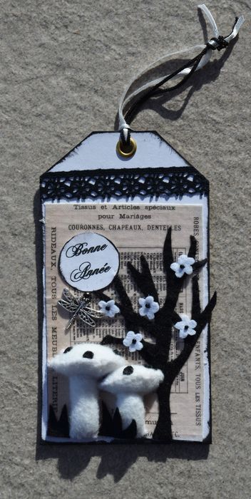 En noir et blanc, de la part de Marie-Pierre, des voeux accompagnés de ces jolis champignons de feutrine fait-main…