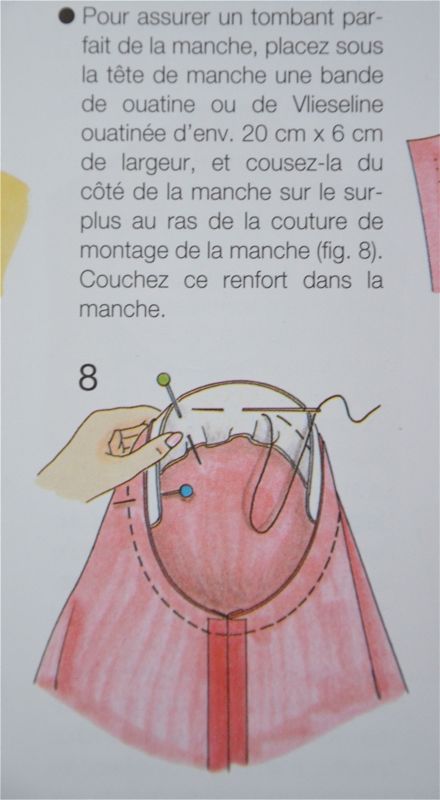 Puis, c’était la tête de manche qui ne me plaisait pas : du fait des fronces, elle « remontait » et faisait une sorte de bosse au-dessus de l’épaule. « La couture pratique » de Burda, m’a donné la solution : coudre une bande d’ouatine d’environ 20 cm de long et 6 de large sous la tête de manche, ce qui a eu pour effet de l’arrondir juste comme il faut. Je vous joins le schéma, ça peut servir…