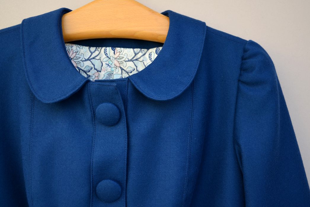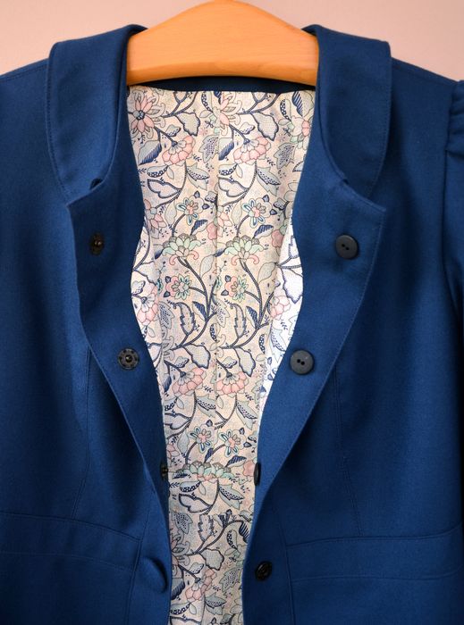 C’est elle qui avait choisi le patron -la veste « Pavot » de Deer and Doe-, qui avait déniché ce joli lainage bleu et le tissu imprimé pour la doublure.