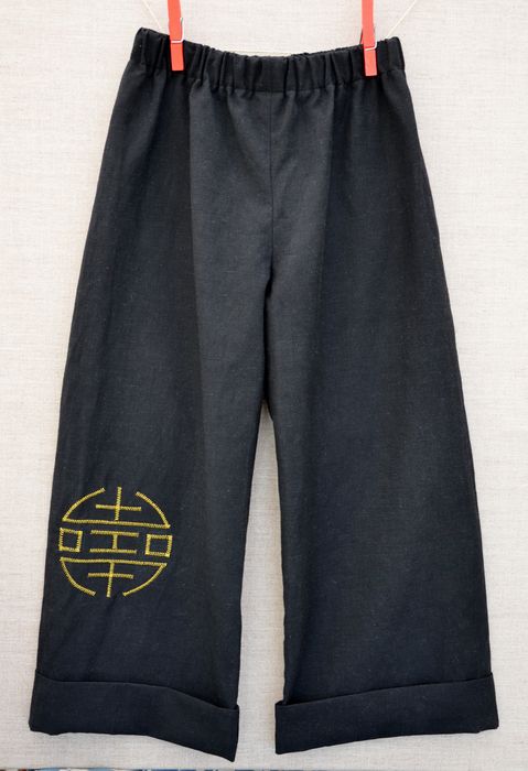 Sur le pantalon en lin noir (d’après le patron du bermuda assorti au kimono garçon dans le magazine, simplement rallongé), j’ai brodé au point zig-zag un des motifs du tissu de la veste, avec du fil doré.