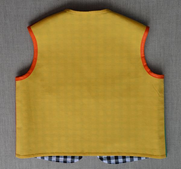 Là encore, pour simplifier, j’ai coupé la doublure d’un seul morceau, en accolant le dos et les deux devants (ce qui évitait de raccorder les carreaux…), donc juste les coutures d’épaule à faire. Puis j’ai assemblé le gilet et sa doublure, endroit contre endroit, le long de tous les bords, sauf les emmanchures ; facile de retourner ensuite le tout par une emmanchure. Emmanchures bordées d’un biais.