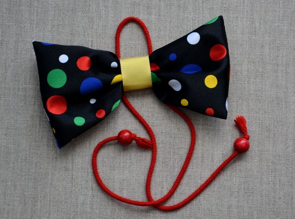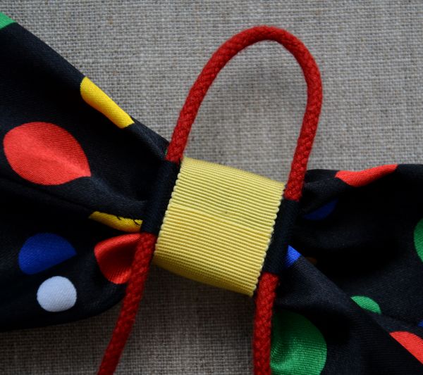 Pour le système d’attache, j’ai pris exemple sur les noeuds pap’ des tontons, que j’avais gardés… Autour des deux brins du cordon, j’ai replié et cousu les extrémités d’un morceau de ruban sergé noir, de manière à former deux coulisses dans lesquelles le cordon peut glisser, puis j’ai collé le sergé sous le gros-grain. Ainsi, le cordon coulisse librement, on enfile le noeud pap’ par-dessus la tête, puis on l’ajuste.