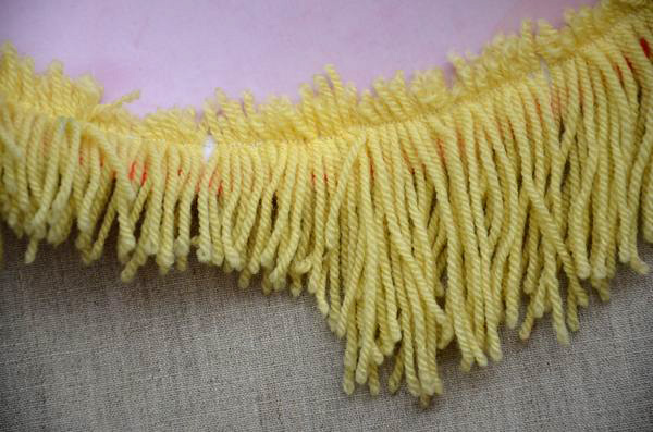 Les « cheveux » sont récupérés sur un chapeau de clown fait autrefois pour les tontons, mais qui avait trop vécu pour reprendre du service. J’avais tout simplement  cousu des brins de laine sur un ruban sergé blanc, que j’ai collé le long du bord intérieur.
