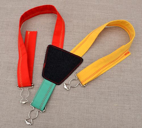 Bretelles bricolées avec des attaches qui avaient servi à maintenir les pantalons des tontons de Malo. Le « triangle » où se raccordent les trois parties : simplement deux morceaux de jean épais, coupés à cru ; un zig-zag près du bord pour assembler les deux morceaux en incluant les bretelles.