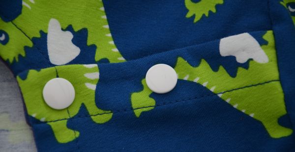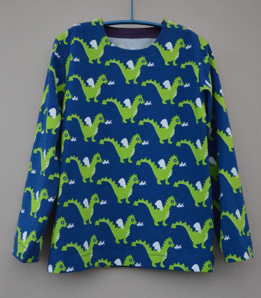 Je n’ai pas voulu utiliser le jersey du T-shirt pour les parements : motifs trop grands pour être coupés sur une petite largeur. J’ai choisi du jersey violet de ma réserve, qui se marie bien avec le vert pomme des dragons.