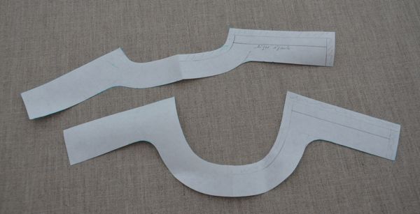 Pour les modifs d’encolure, j’ai rallongé les devants et dos d’un centimètre au niveau des lignes d’épaule (ainsi, le milieu des pattes correspond à la ligne d’épaule), et je me suis fait un patron pour les parements patte-encolure.