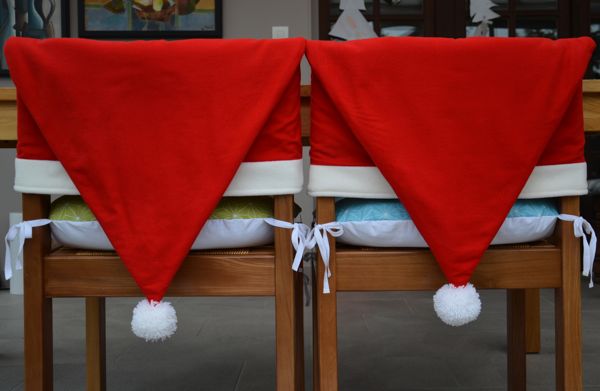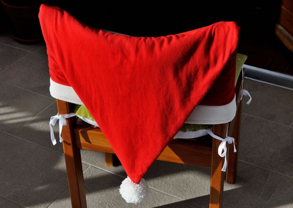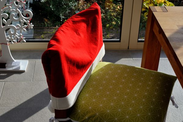Depuis bien longtemps, j’avais en tête de faire des bonnets de Père Noël, pour les dossiers de chaise.
