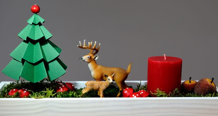 Puis, de la mousse, un sapin origami, une grosse bougie rouge, un cerf et un faon (? -je n’ai guère de connaissances zoologiques-).