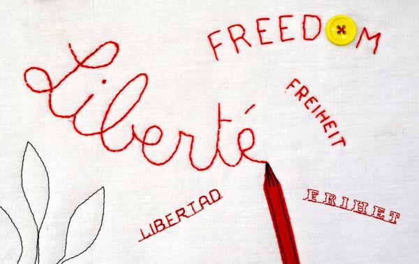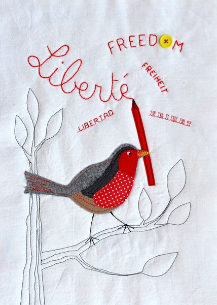 Tu me laisses une fois de plus sans voix. J’aime autant le motif (avec le crayon et les mots « liberté » en plus, bien évidemment) que ta finesse de réalisation. Pour quelqu’un qui voulait essayer le piqué-libre, tu es déjà super douée !