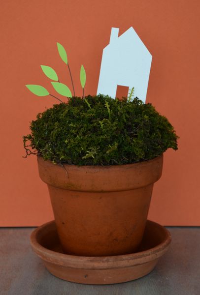 Déco printanière minimaliste : mousse du jardin, maisonnette blanche en carton collée sur une pique en bois, feuilles vertes fixées avec du masking tape sur un bout de fil de fer…