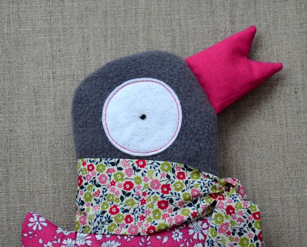 Polaire grise, reste de cette veste ; coton vert anis, reste de la confection d’un drap ; coton violet à pois, comme le col ; coton rose et liberty de ma réserve. Comme d’habitude, les yeux (un sur chaque face ici) sont en feutrine, fixés avec du thermocollant double-face puis piqués.