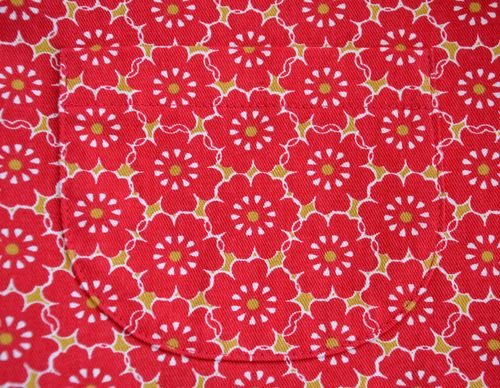 Je n’ai pas osé me lancer dans la confection des poches fendues. Je les ai remplacées par deux petites poches appliquées, arrondies, coupées de telle sorte que leur motif se superpose exactement à celui des devants, pour ne pas « casser » ce joli semis de fleurs.