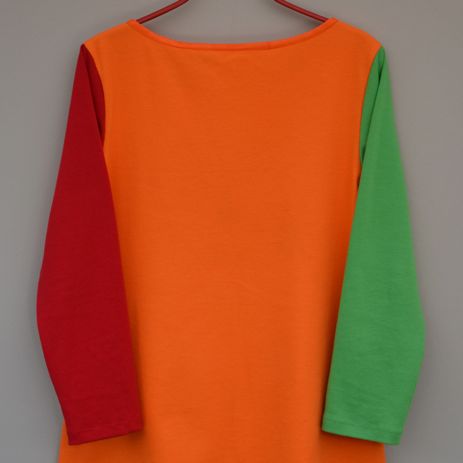 Interlock orange et vert du magasin Karstadt à Sarrebruck ; reste de jersey rouge (juste suffisant pour une manche !) ; reste de biais orange pour l’encolure.