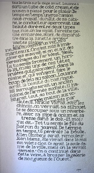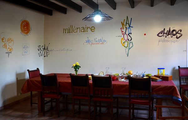 Marie nous a accueillis chaleureusement, comme des amis, puis nous a menés à notre chambre : refaite à neuf, décorée, comme les quatre autres du gîte, d’un texte géant calligraphié sur le mur (un extrait de « Sur la route », de Kérouac, pour la nôtre) ; large lit confortable ; salle d’eau impeccable ; vue et accès indépendant sur le jardin.
