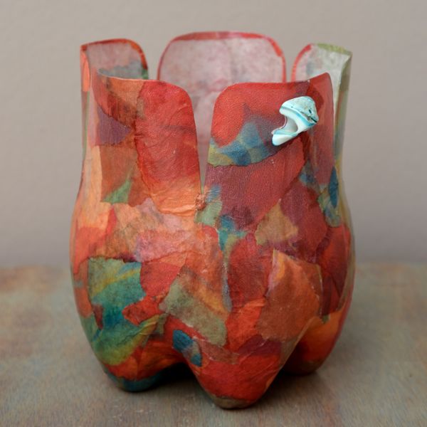 On coupe le bas de la bouteille, puis on y fait cinq entailles verticales, régulièrement espacées, d’une longueur à peu près au rayon de la bouteille (si elles sont trop longues, on peut toujours rectifier). Il suffit ensuite de rabattre une à une les cinq « pattes » obtenues… (pour que ce soit facile, recouper les entailles légèrement en V, et arrondir les angles).