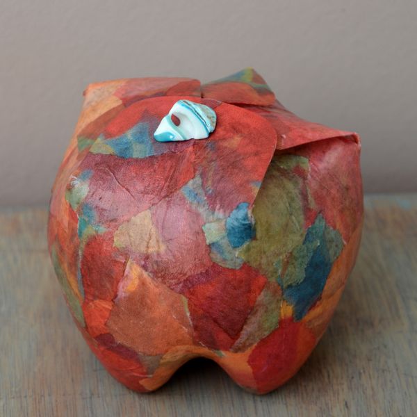 Il ne reste plus qu’à décorer. Ici, la boîte est recouverte de papier Décopatch à grosses fleurs, déchiré en petits morceaux collés avec du vernis-colle. Quand tout est sec, une couche de vernis-colle pour la finition, et une petite perle pour faire joli.