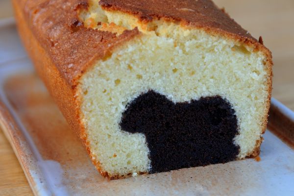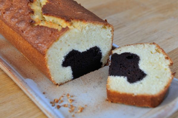 L’astuce ? On réalise d’abord un cake au chocolat, on le coupe en tranches épaisses et on y découpe des formes à l’emporte-pièce (un mouton pour moi), qu’on dispose bien serrées dans le fond du moule à cake. Puis on y coule la pâte à la vanille…