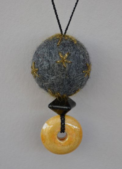 Quelques pois jaunes sur la perle chinée (feutrage à l’aiguille), des étoiles rebrodées sur la perle grise avec de la laine mohair rehaussée d’un fil doré, des perles en céramique et en bois de mon stock. Le cordon noir provient d’un de ces rideaux formés d’une multitude de longs fils, qu’on voyait partout il y a quelques années (récup’)…